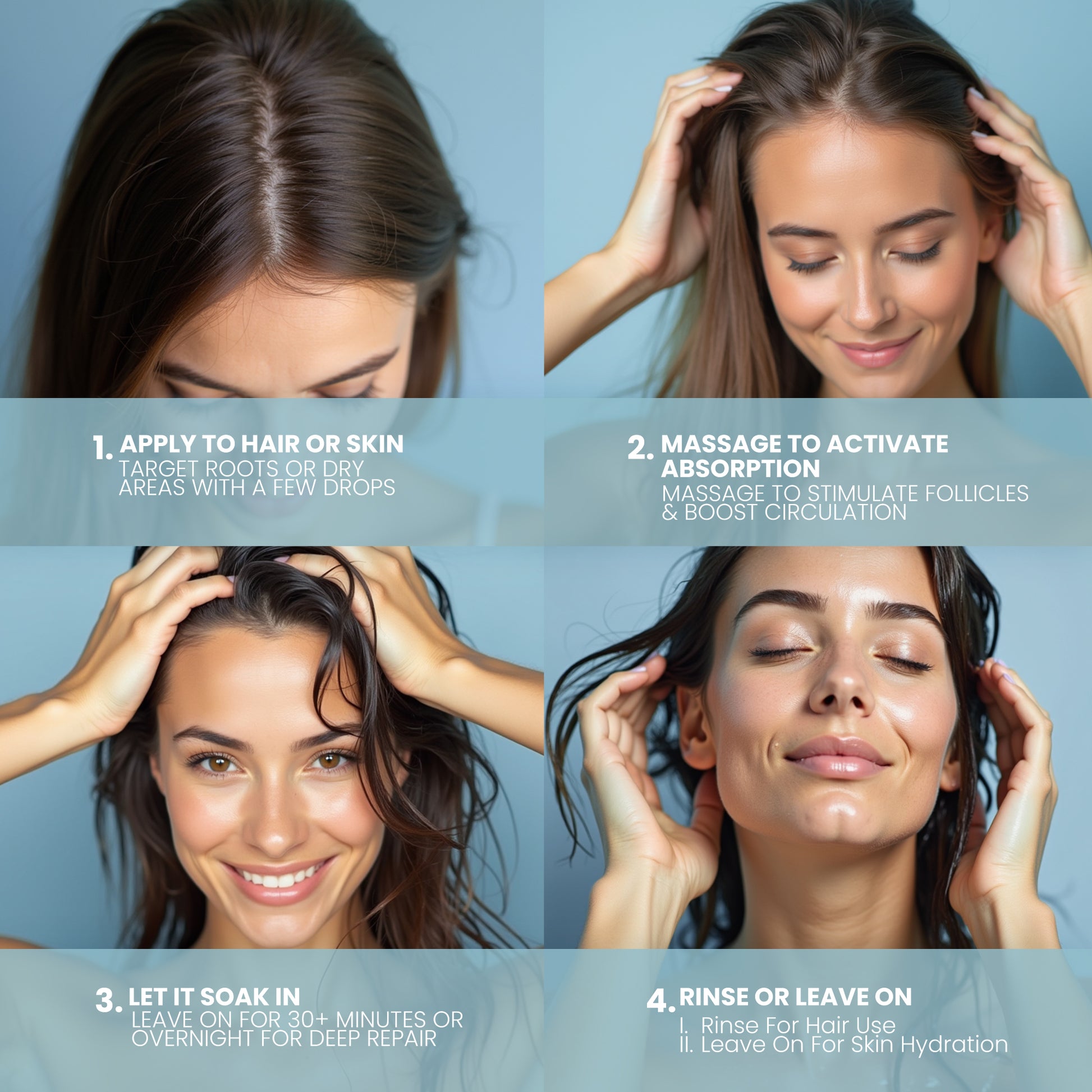 For Hair: Warm a few drops between your palms and apply to damp or dry hair, focusing on ends and scalp. Leave in or rinse after 30 minutes for a deep treatment.