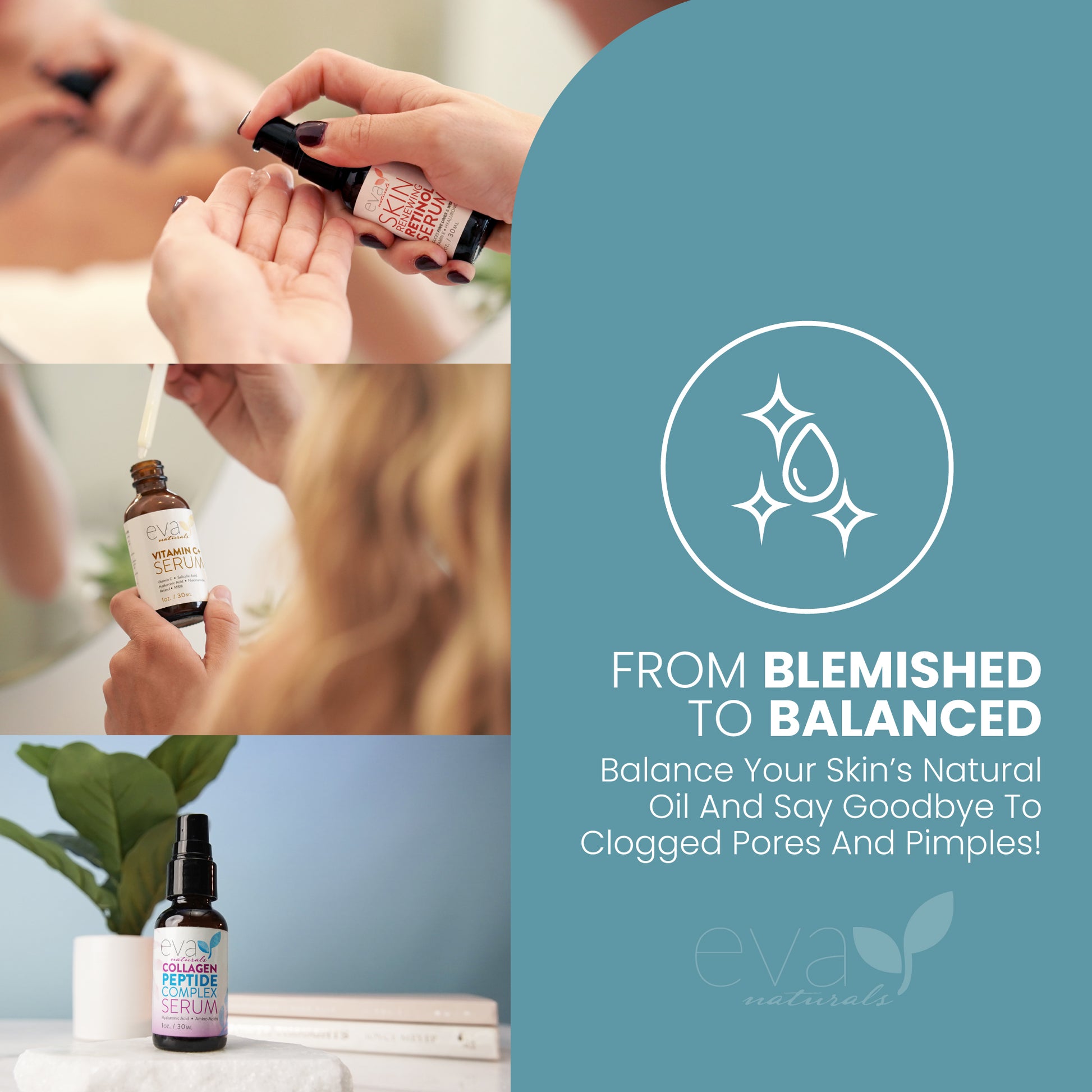 Eva Naturals is happy to bring you our Best Seller Trifecta Bundle, which includes 3 of our most popular, most powerful products, each with a unique formulation and benefits. Start with our Retinol Serum to clear and tighten pores, then our Vitamin C+ Serum to bring your skin a renewed, glowing complexion. And finally, finish of with our Collagen Peptide Complex Serum to soothe and nourish your skin, boosting its collagen production, and smoothing out fine lines and wrinkles.