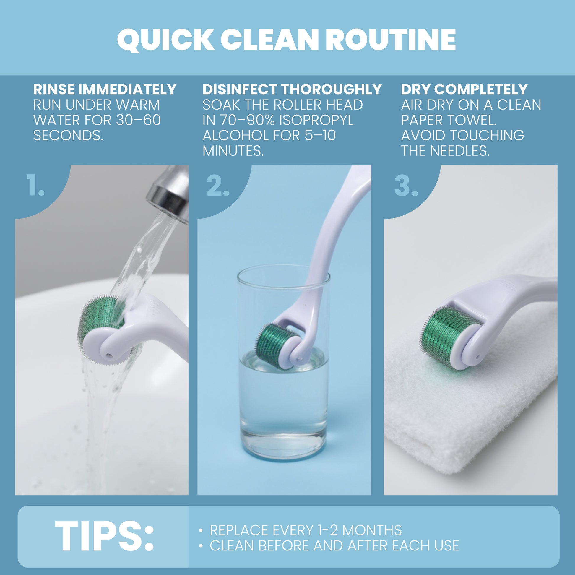 Disinfect: Sanitize your microneedle derma roller with rubbing alcohol before and after each use to ensure hygiene.