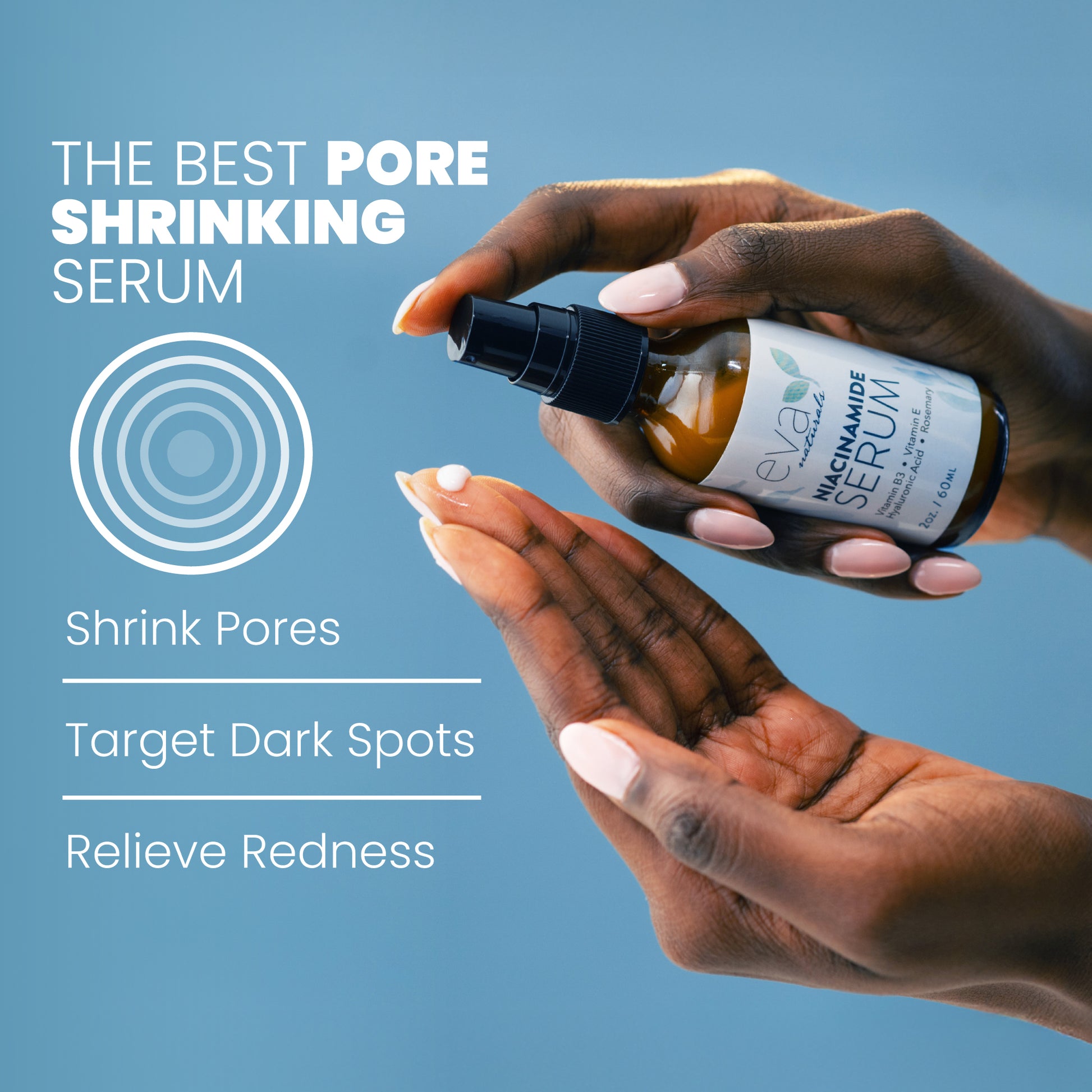 Eva Naturals unique Niacinamide Serum brings you the anti-aging benefits of Niacinamide and Hyaluronic Acid in one powerful serum! Simply add it to your existing skincare routine and let it go to work fading dark spots, shrinking pores, and giving your skin the youthful, glowing complexion it deserves!