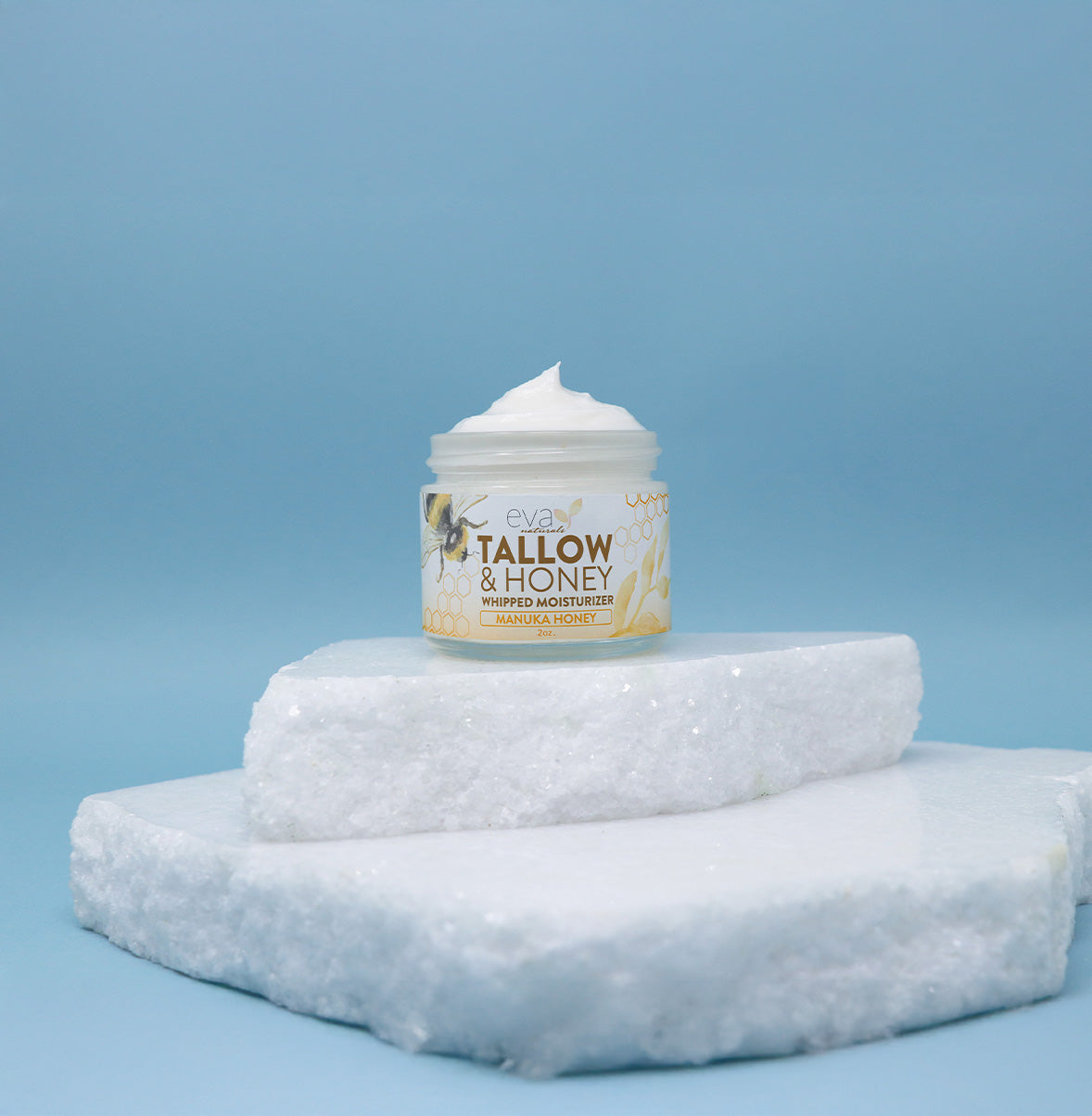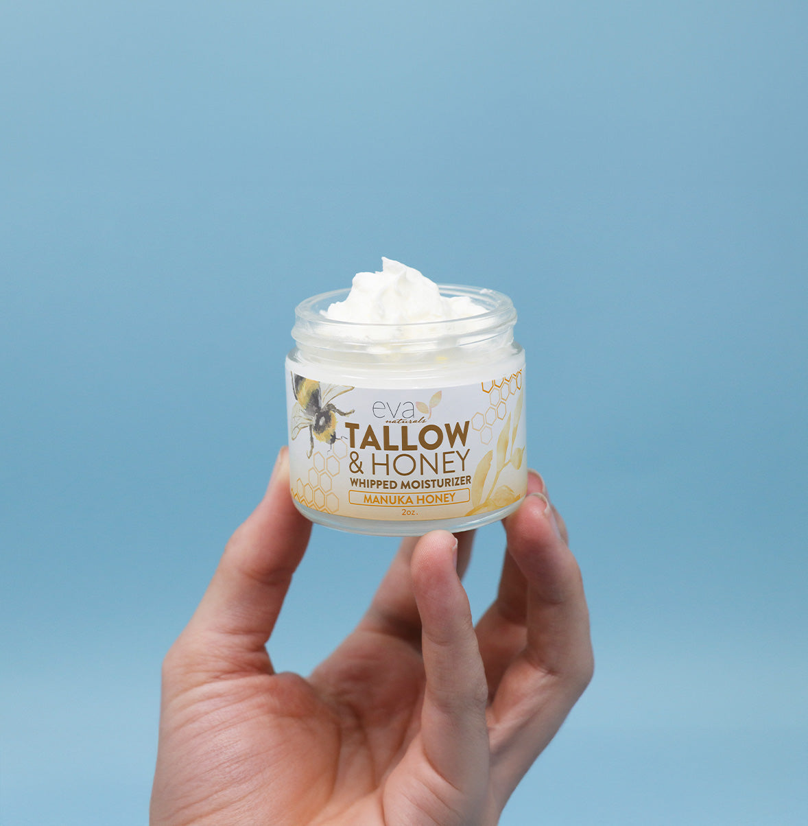 We here at Eva Naturals are excited to bring you our new Whipped Tallow & Honey Moisturizer! Simply formulated with only two potent ingredients, this moisturizer is a perfect solution to anyone looking to bolster their skincare routine without including harsh chemicals and additives. Our U.S.-Sourced beef tallow comes from grass-fed, grass-finished cattle, and our manuka honey is rated 850+ MGO, ensuring effectiveness while staying suitable for sensitive skin.